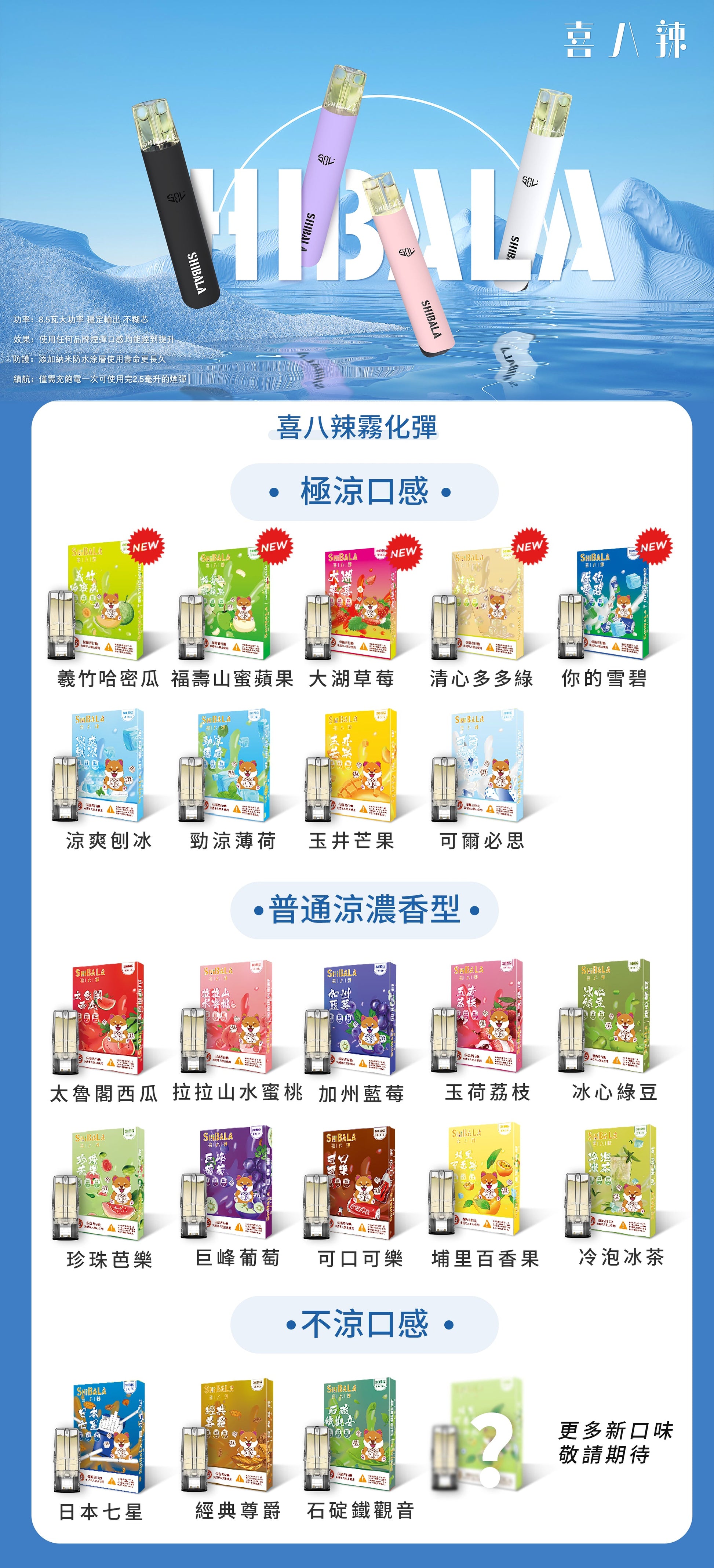 喜八辣煙彈 擁有 極涼口感-普涼濃香-不涼口感 三大類型,滿足不同口感需求。